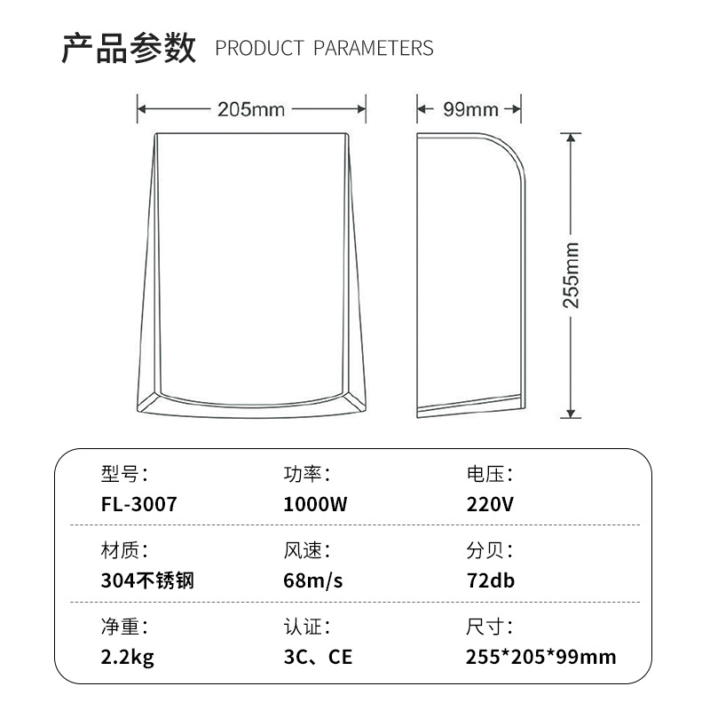 | Brand : Farin,FL-3007,2021,3007,304 stainless steel,65±15 ° C,220,1000,50,Home delivery,Stainless Steel,Wall-mounted,255*205*99mm,2.5kg,Vertical,Shop Three Guarantees,3kg,Brushed 304 stainless steel FL-3007,White ABS plastic FL-2007,No,Hand dryer |