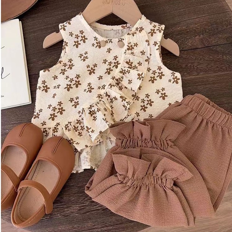 Girls suit new summer Korean children s clothing baby Summer western style leisure two piece set (wood button)